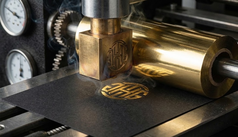 • Mô tả ảnh: Cận cảnh quy trình ép kim Logo màu vàng Gold lên bề mặt giấy in. Khuôn ép kim nóng in xuống giấy tạo nên vết lõm ánh kim sang trọng.