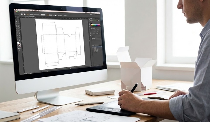 • Mô tả ảnh: Một nhân viên thiết kế đang làm việc trên máy tính với phần mềm Adobe Illustrator. Màn hình hiển thị bản vẽ kỹ thuật (die-cut line) của một chiếc hộp đang được trải phẳng. Bên cạnh là một mô hình hộp giấy trắng đã được cắt mẫu.